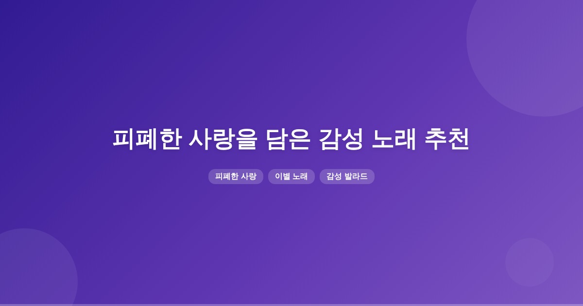 피폐한 사랑을 느끼는 노래는 보통 이별 후의 허탈함과 아픔을 담고 있습니다. 추천하는 곡으로는 케이시의 ‘이런게 사랑이라면’, 김나영의 ‘이별후회’, 빅마마의 ‘아무렇지 않은 척’ 등이 있습니다.